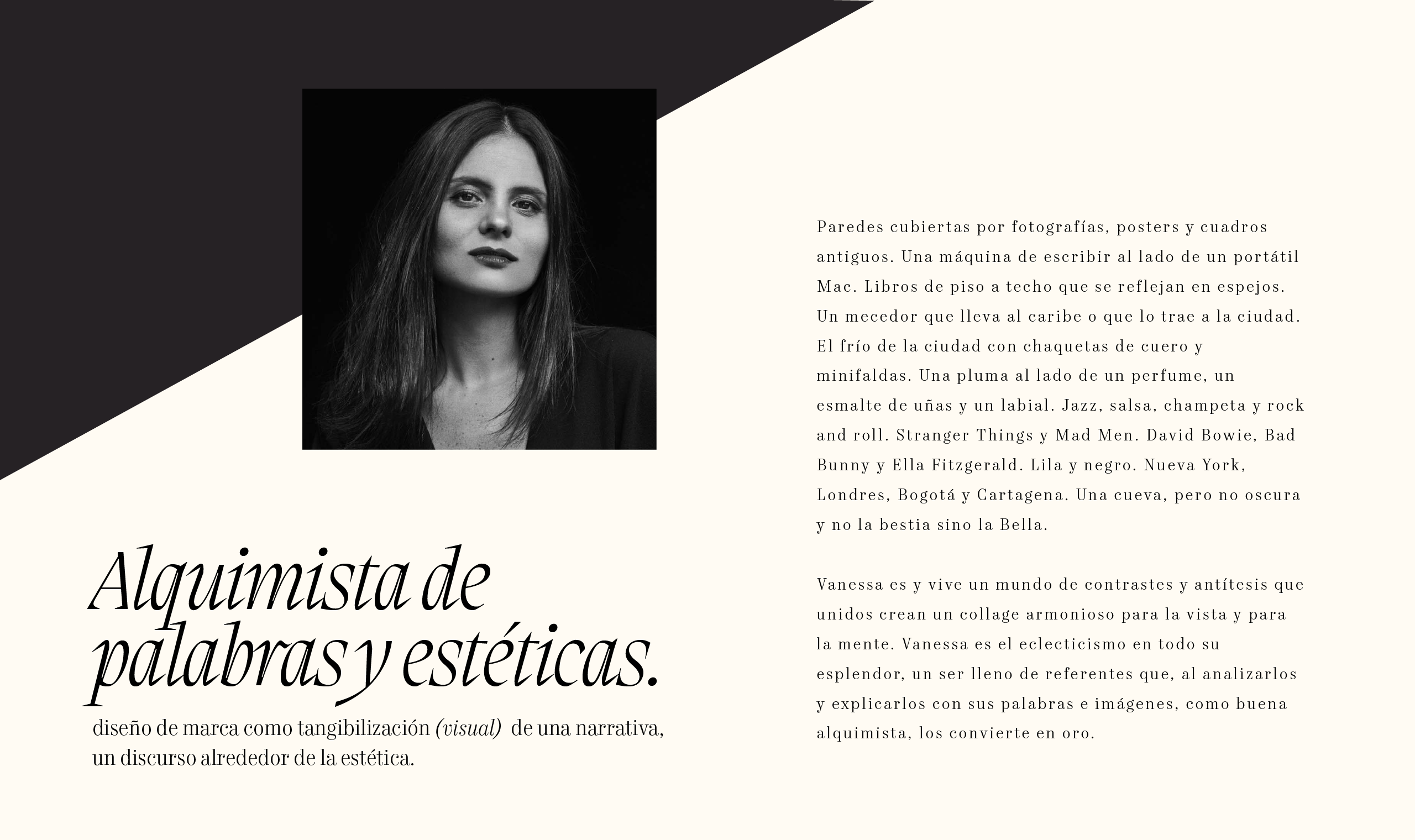 The personal brand designed for Vanessa Rosales, the Colombian writer, and fashion historian. This brand aims to show Vanessa as an eclectic woman who enhanced the power of aesthetics as a cultural mirror. The main resource used is a collage in order to show her diverse, mixed and powerful perspectives on fashion, women, and culture. Vannesa Rosales, the alchemist of words and aesthetics